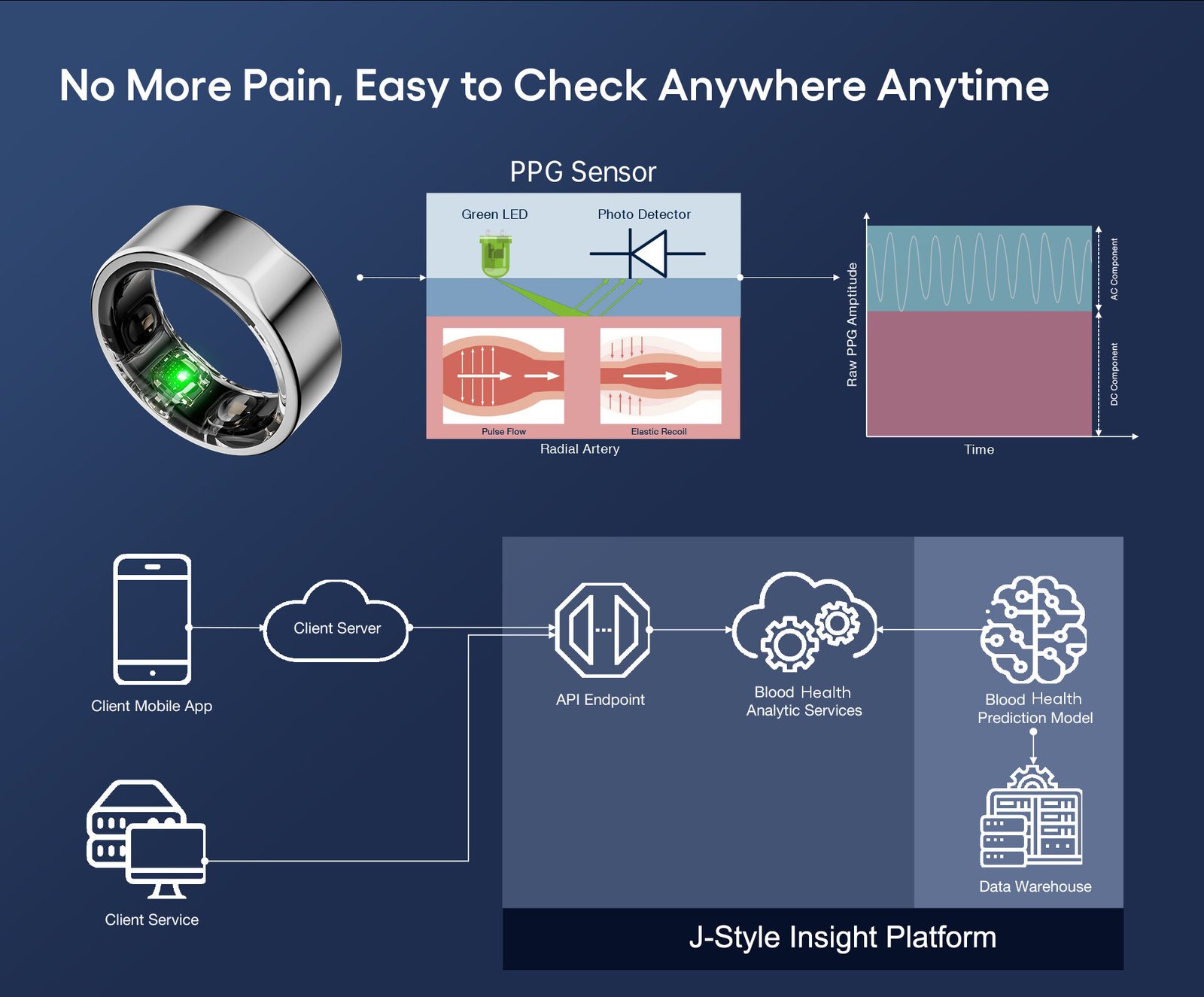 Comfortably wear JCring all day and night to collect deeply personal health metrics and insights. Your finger provides the most accurate reading of over 20 biometrics that directly impact how you feel.