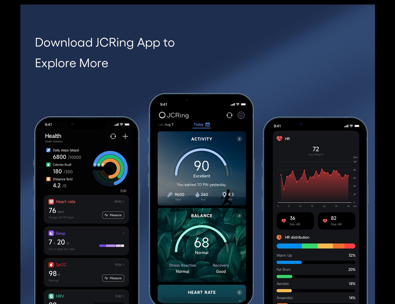 Monitor your health 24/7 with the guidance ofJCRing Care, a smart titanium ring designed tobalance your health.